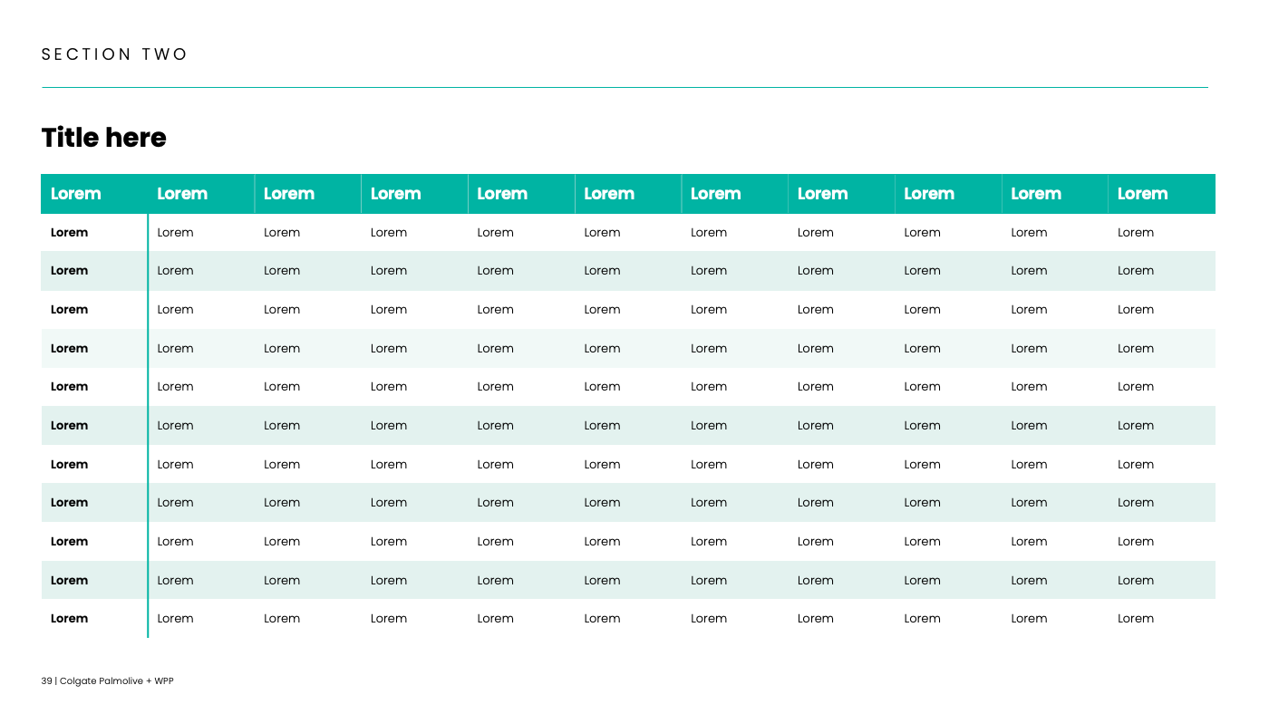 Within a one-week timeline, I led the creation of a vibrant, puzzle-inspired PowerPoint template for Colgate. This bespoke system was designed to support global teams across C-suite, marketing, finance, PR, content strategy, media planning, and data analytics—ensuring every user could deliver on-brand presentations with ease.